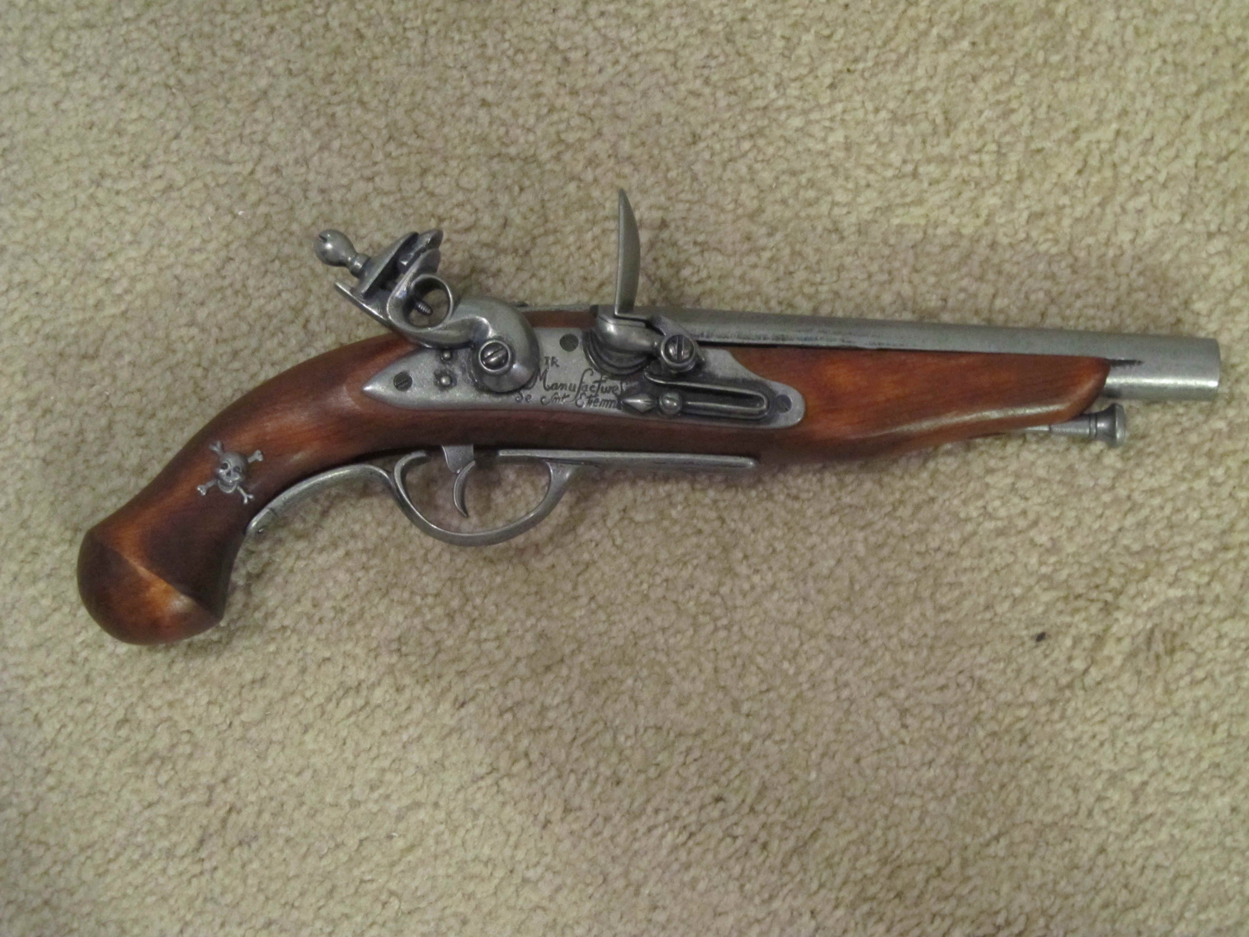 This is my replica flint lock pistol. Once again the skull and crossbones is out of place. This one is cocked so the shield is over the powder igniting pan. The expression "keep your powder dry" derives from this weapon. You had to be very careful to keep the ignition powder in the pan dry and from blowing out. Even if you did misfires were common.