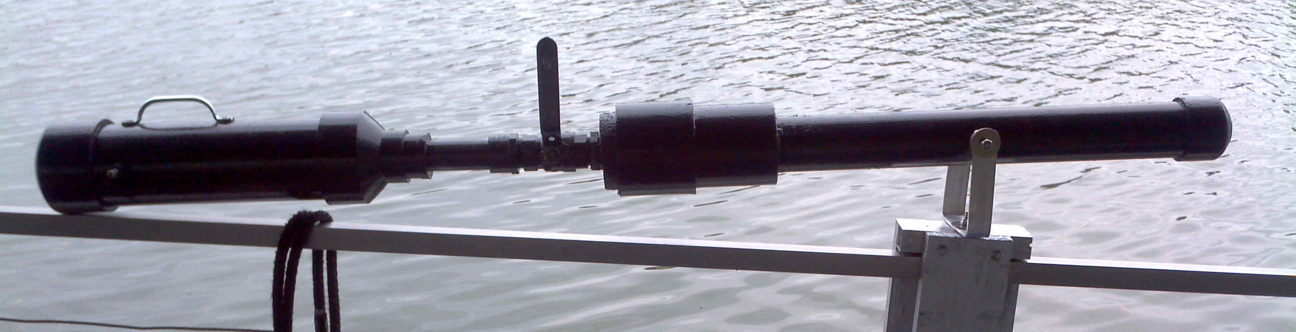 The swivel or rail gun was a favorite pirate weapon. With it they could damage sails and rigging making escape difficult for their victims. If necessary it could be used as an antipersonnel weapon at close range. Mine is made almost exclusively with high strength, schedule 40 PVC. It is also our major weapon shooting full size marshmallows about 100 feet with 25# of air. My air cannons are intended to be as good replica as I can achieve and still be usable. The air chamber is to the left, the firing brass quarter turn valve with the handle sticking up and then the gun and swivel mounting. Here it is mounted on my railing so the pirates/passengers can fire it. Plans for simpler versions of the swivel gun and rifle well be available free here. Full plants, specifications, and building information will be available in booklet form for about $25. Building the cannon is quite a task and requires good tools, hard work and infinite patients.