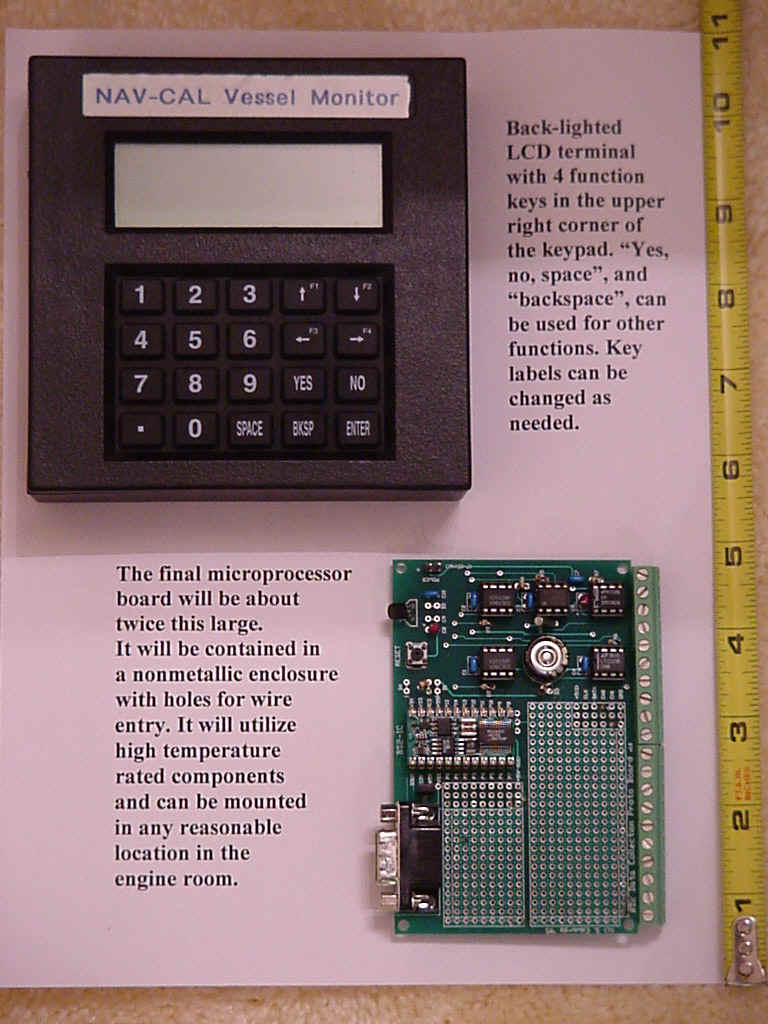 The Multi-Engine Motor Vessel Monitor (NCMEMVM) uses a small microprocessor to capture analog and digital signals. This microprocessor performs data conversion on the input signal and displays the values on a small (5 by 5 by 1.5 deep) 4-line by 20-character back-lighted LCD terminal located in the pilothouse. The system also accepts GPS input to provide latitude, longitude, course, and speed over ground. This device is designed to monitor up to two engines or generators or any mixture thereof. |